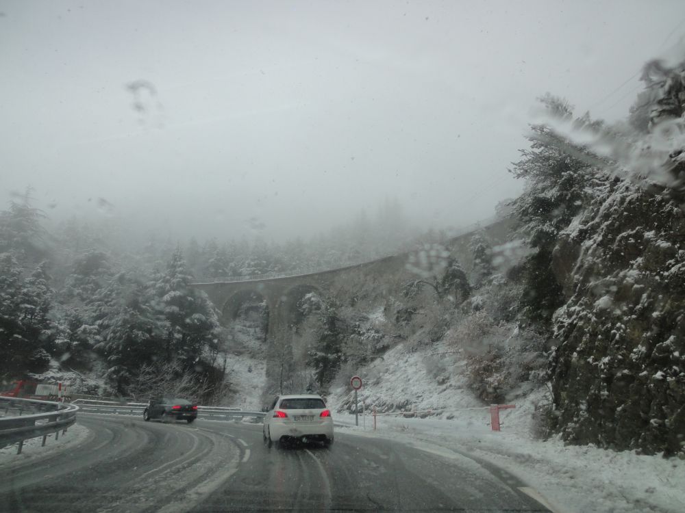 Here we are on the road up to the Cerdagne. On the plateau, 1200-1600m, we will find some 10 to 20cm of fresh snow on the roads. We are in the mountains – “real” mountains – and even in May, the weather can be rough in the Pyrenees. My friend took the photo, while I was driving carefully; my car is a four-wheel drive.