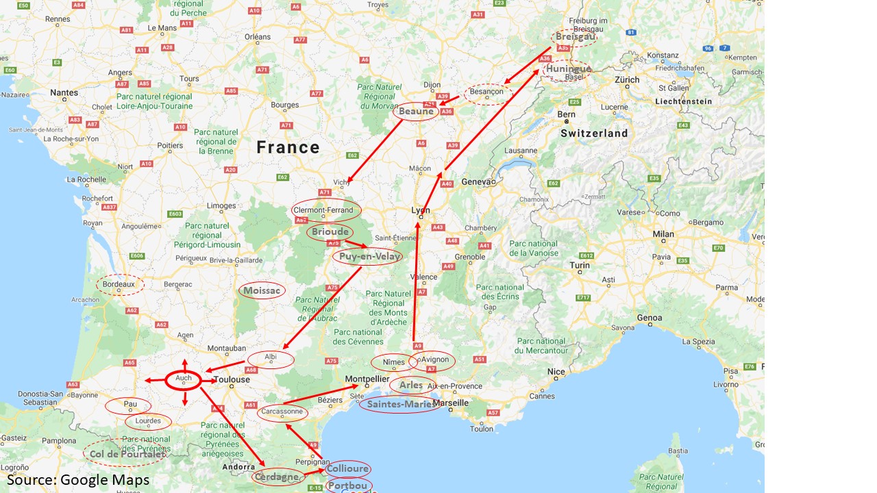 After having visited Bordeaux, Mimizan and Toulouse, Eugen and his wife left Auch to return to Germany performing a round tour to the Mediterranean Sea.