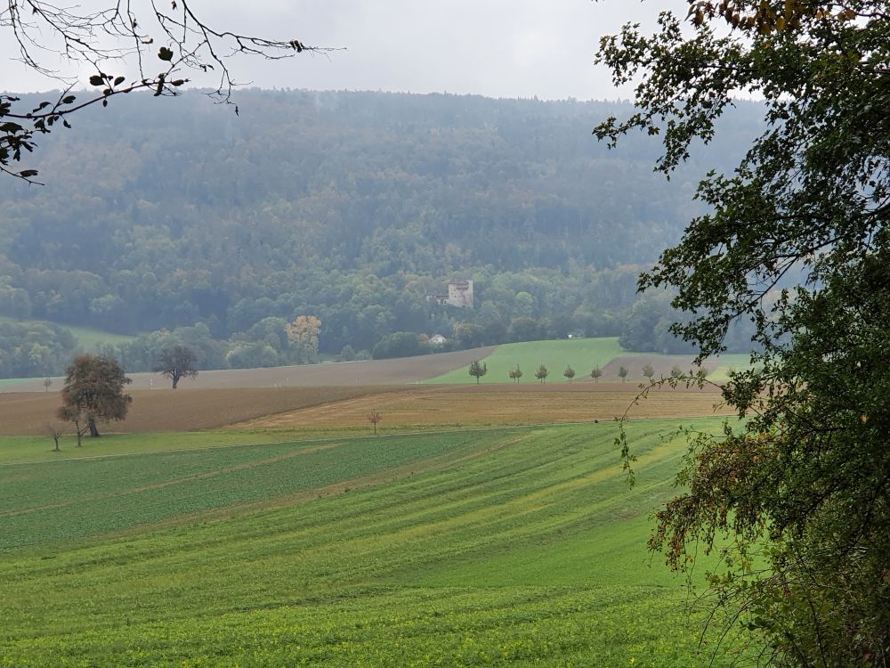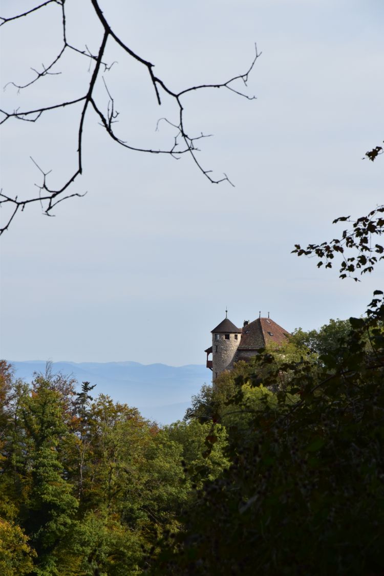 The castle Burg Rotberg is beautifully located on the slopes below the Blauen chain, as seen from across, from the north, when walking from Mariastein to Metzerlen.