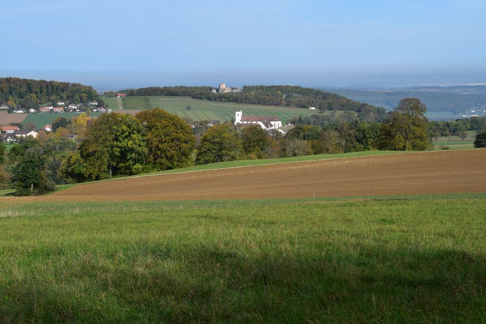 Across, from the south, the panoramic path at the foot of the Blauen chain provides the view of Mariastein with the castle Landskron in the background (the Landskron is already located in France).
