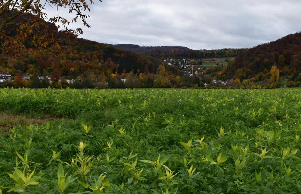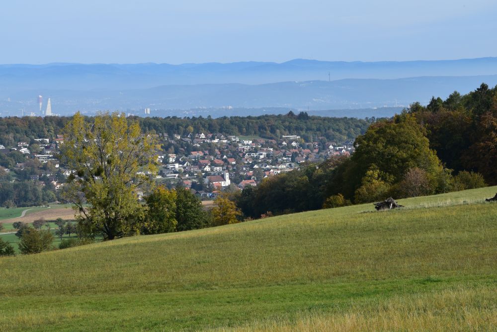 When continuing my way along the foot of the Blauen chain towards Hofstetten, I enjoy the panorama; Hofstetten is located in the foreground; in the background we can see the city of Basel and the Black Forest.