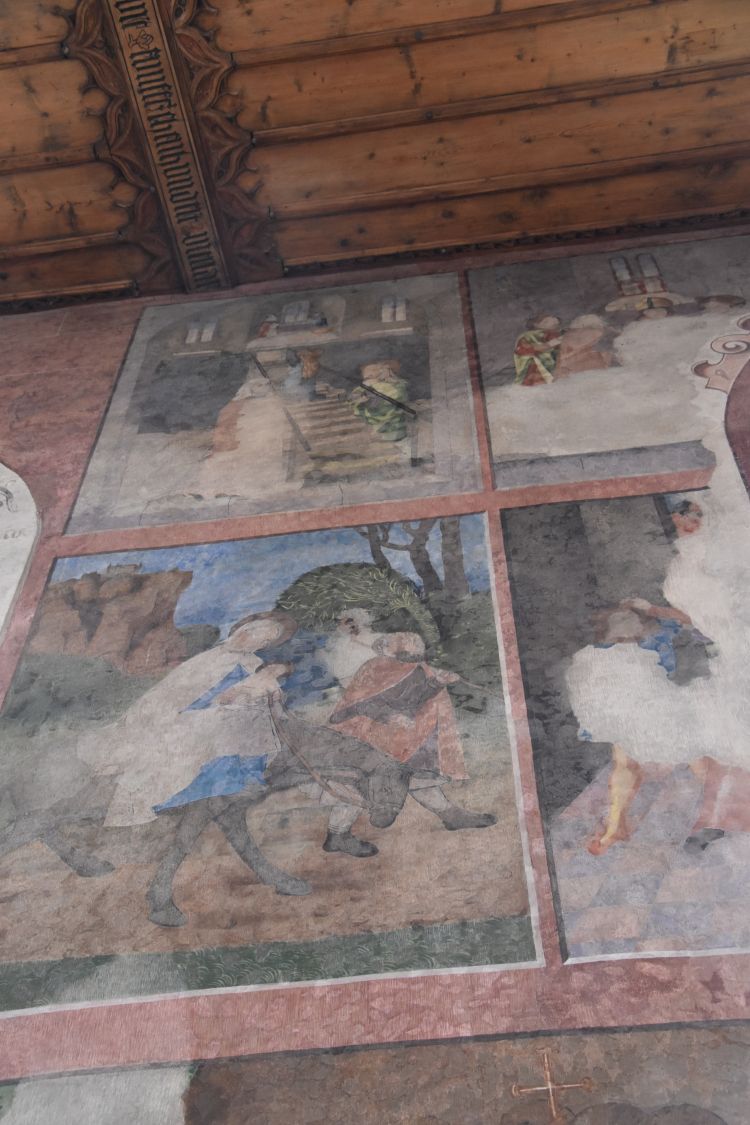 Around 1470, Muttenz reports into Basel. The Münch need money and they pledge Muttenz to Basel. The Saint Peter Canon administers Muttenz and sponsors the church. In 1504, the canon makes the nave higher enhancing the space available for frescoes. In 1507, the canon decides to redo the paintings, while integrating and renovating the legend of Arbogast and the Resurrection niche. The northern wall shows the Passion of Christ and the southern wall is dedicated to the life Maria and Christ. This is the southern wall. The best preserved fresco shows the flight to Egypt.