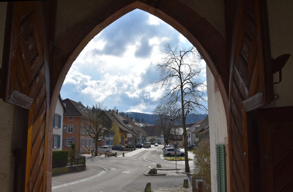 In 1430, the Münch-Eptingen surround the church with the defensive wall and two gate towers. The coat of arms of the Münch, a monk, is on the northern gate tower, above the entry.