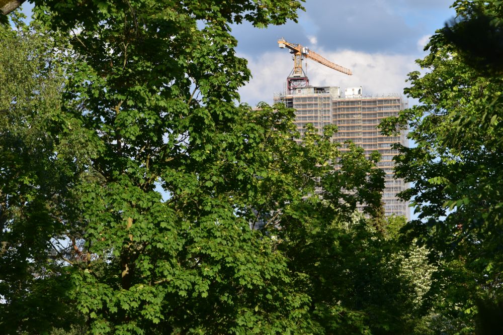 Today, we see trees from the top, beautiful tall trees. There is a platform topping the Ruth-Andreas Friedrich Park. Dogs run around on the meadows, sportsmen jog uphill and take a rest on the platform.