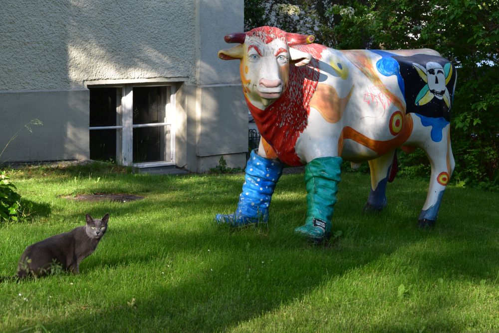 Next door, number 4, is the Evangelisches Jugend und Fürsorgewerk (EJF). In the garden, the bull gives audience to his friend, the grey cat with sparkling green eyes.