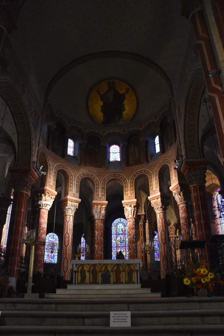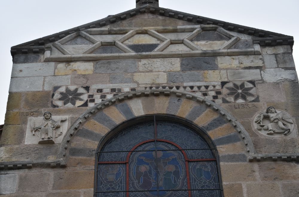 The Paroisse is famous for the choir that has been freshly renovated. We admire the fine patterns created by black basalt, grey granite and yellow arkose. We are in the area of the volcanic Puys around Clermont-Ferrand.