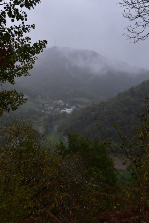 The weather is misty and rainy. We drive through the Aubrac. Through chestnut trees, the road takes us down to the Lot valley.
