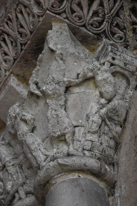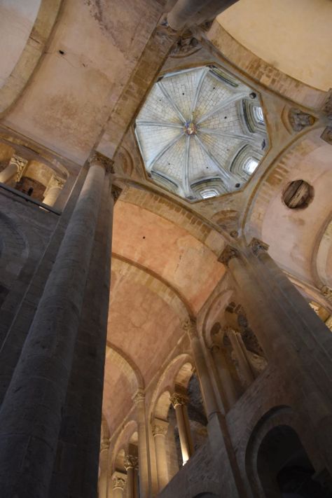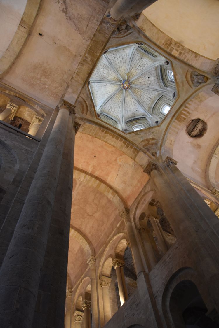 In the 19th century, the church has been painted inside. This creates the solemn atmosphere that existed in Romanesque times, though the painting is not authentic. Ursula discovers maize plants on some columns… definitively not authentic for the XIth or XIIth century.
