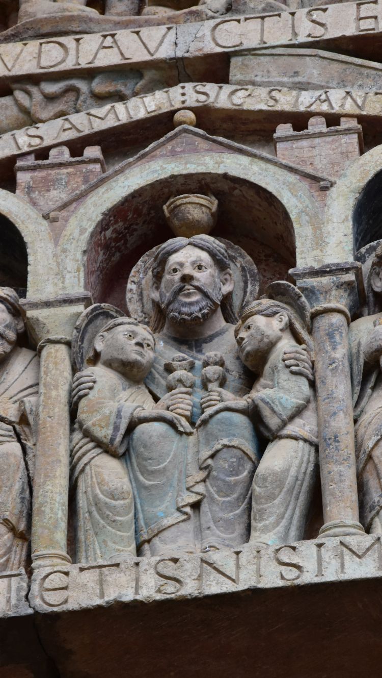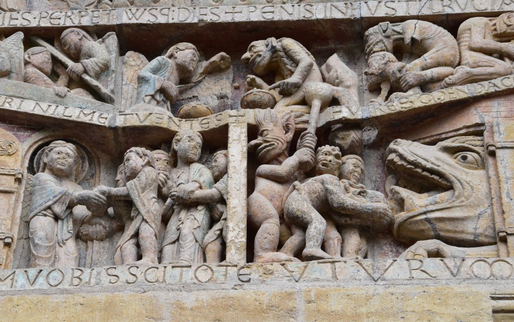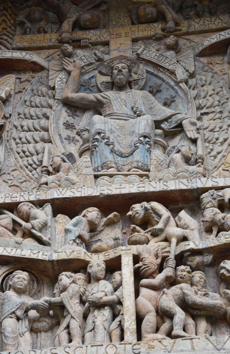 The main portal is decorated with the beautiful tympanon showing the Last Judgment (late Romanesque style). About 120 figures populate the tympanon. It can still be recognized that the Last Judgment was originally painted in colors.