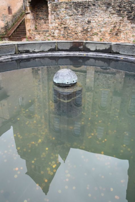 The next morning we return to the church and the cloister. I discover this fountain with the conch of St. James in the middle and with the reflection of the Abbey Church ornated with the coins thrown into the fountain.