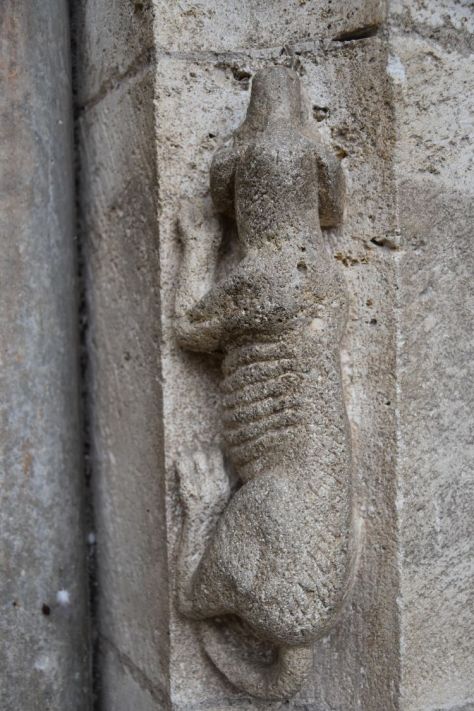 On the side portal we find the wise and the foolish maidens. These are the foolish maidens that are being seduced by the man on the left… he shows off, but his back is covered with snakes indicating that he cannot be trusted. A very similar seducer is also decorating the cathedral of my home town Basel. Strasbourg served as the model for Basel (and other churches in the area).