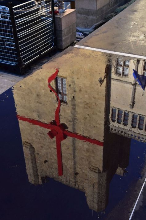 The Chapel of St. James from the 12th century reflects in the ground slabs that are wet from all the rain of the last days.