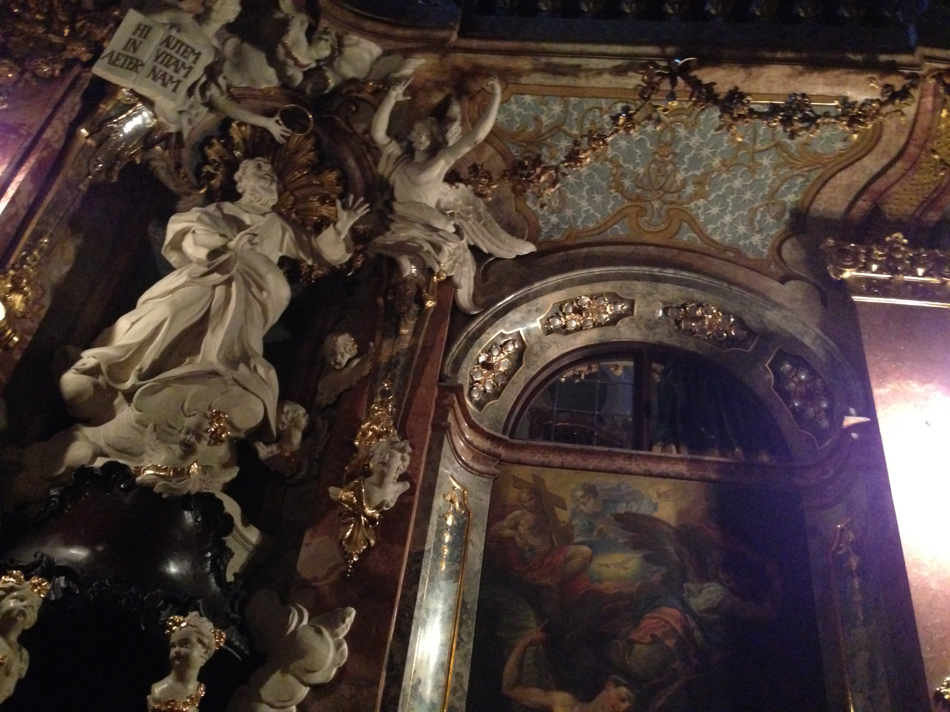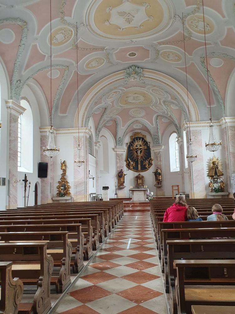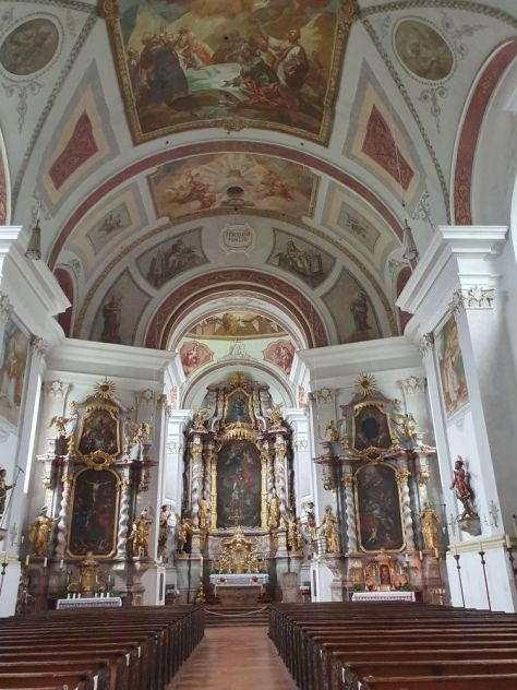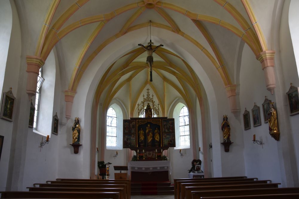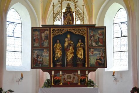 In the altar we can see Saint Valentin in the middle, Saint Dionysus to the left (again with his second head in his hand like in the Streichen chapel) and Saint Conrad of Konstanz (his typical sign is the cup) to the right. In the wings are Saint Augustinus and Saint Zeno (the latter we have already met at Bad Reichenhall).