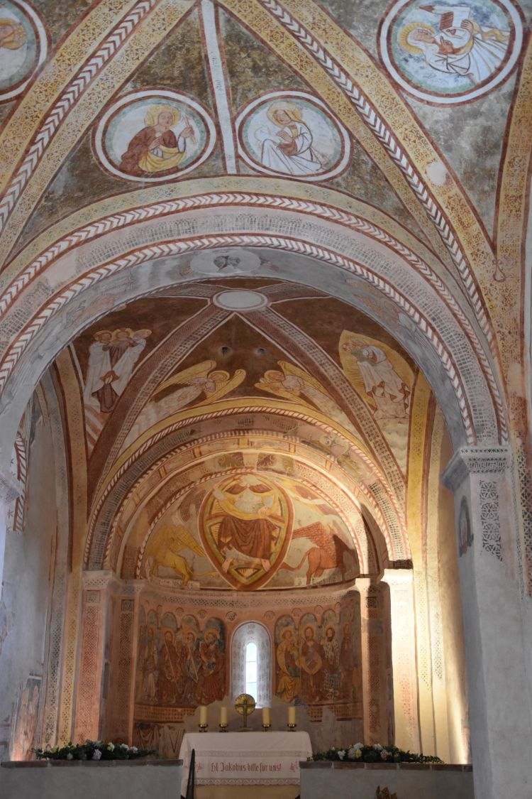 The frescoes in the gothic choir are from 1450. They have been uncovered in 1955. Christ is in the middle.
