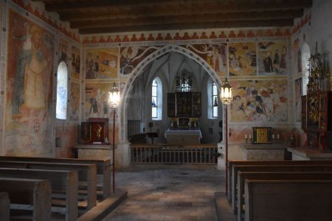 The booklet of the chapel, edited by Schnell and Steiner, assumes that the nave has been constructed in the 13th century, though the first records of the church appear only in 1440. At that time, the apsis was replaced by the more spacious choir with the rib vaults that we see today. In addition, the chapel was then decorated with frescoes that, with some changes in the 16th century, have been preserved under whitewash. It was a cultured and art-minded priest that initiated the uncovering of the frescoes in 1943/44. The stepwise renovation of the chapel was completed in 2014. Most of the windows in the choir are the originals; the glass roundels have been preserved.