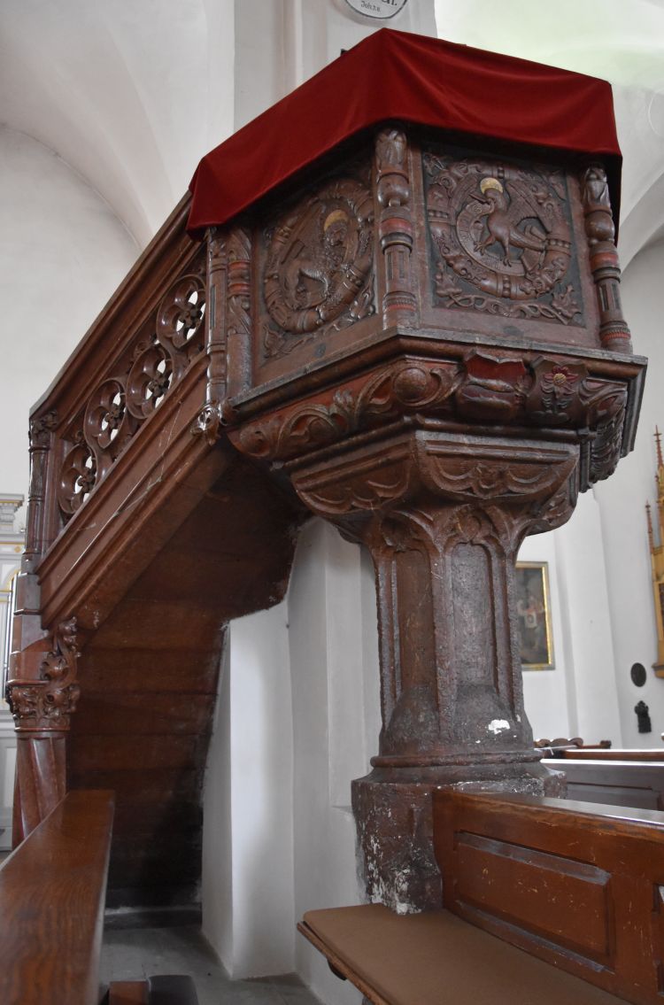 In the altar from 1940 are a figure of Saint Nicolas (around 1700) and Stephan (to the right) as well as Laurentius with the grill (to the left, both early 16th century).