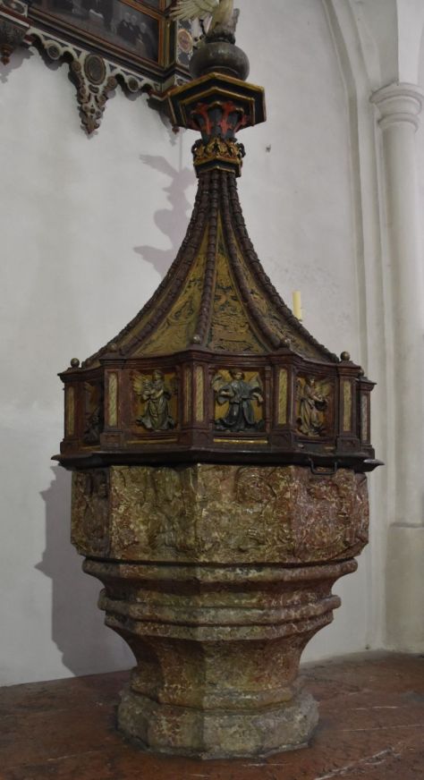 The booklet by Heinz Scholz mentions the old window from 1420 showing the Annunciation and the birth of Christ. We look for that window everywhere. We see a coloured window near the entrance to the church. My friend looks through the key hole of the entry on the gallery, but no, this is not this window. What has happened to this treasure?