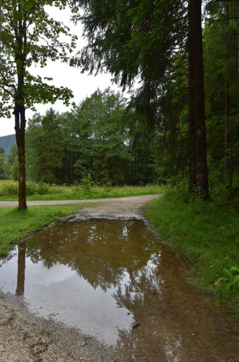 It is drizzling, when we park our car close to the border between Bavaria and Austria, above the Schlechinger Tal. In the misty forest we walk uphill to the Chapel Sankt Servatius auf dem Streichen, located on a path for traders that transported goods from Bavaria (Unterwössen) to Tirol (Kössen). The attribute “auf dem Streichen” alludes to the trading traffic: “Streichen” is an older word for “Säumerpfad”, and “Säumer” or “Streicher” are the people transporting goods; “Säumerpfad” translates as mule track – the Anglosaxons seem to think of the mules on such tracks.