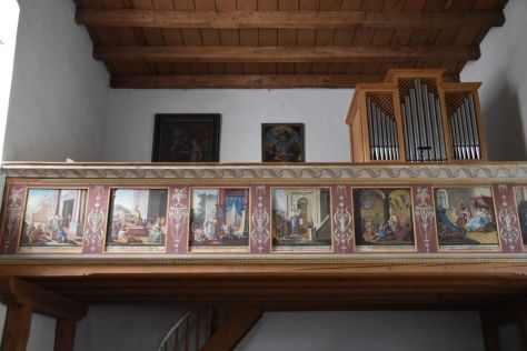 An iron grating prevents visitors from entering the nave. We look at the precious frescoes of the nave from behind the grating. Above the entrance to the choir, I discern the annunciation scene with Maria and the Archangel Gabriel. The next fresco to the left shows Saint Leonhard, patron of the prisoners, with two prisoners whose feet are fixed in a block. Below, to the right hand side of the choir, the three Kings are visiting Christ after his birth. The writer of the booklet edited by Schnell and Steiner is of the opinion that this is the most precious fresco of this church.