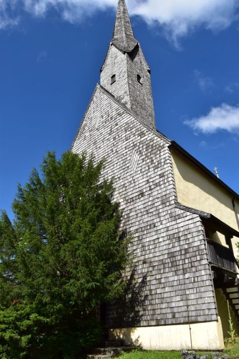 Wooden shingles cover the roof, the tower and one side of the church building.