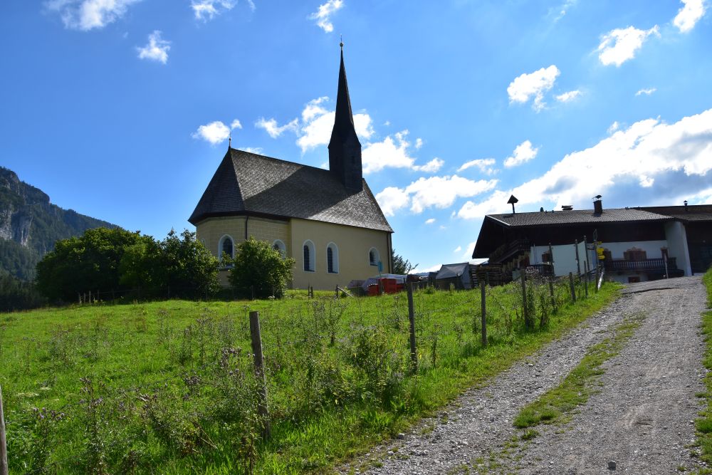 On our third day, the sky is brightening up, and we go for our first hike. We visit the nearby small church Sankt Nikolaus im Oberland in the hamlet Einsiedl. The church was built around 1200. Legend tells that a duke serving Barbarossa fought war against Salzburg and destroyed the city. This was too much. He should not have destroyed the city. Barbarossa banned him and sent him to this lonely place, where the duke built the small church dedicated to Saint Nikolaus and a farm.