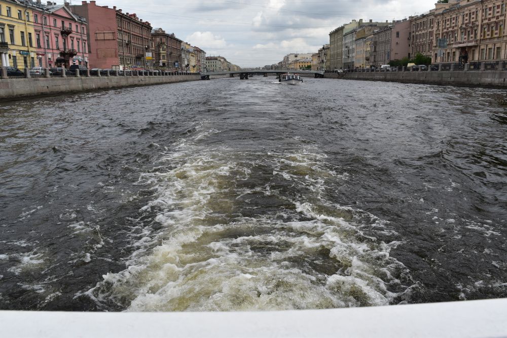 The channels Moika, Fontanka and Griboedov as well as the Neva are great for a boat trip – we did two of them. Here our boat is flying along the Fontanka close to the houses called “Three Sisters”.