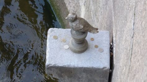 There are coins on the small platform that the bird stands on. Here you see that people are throwing the coins aiming carefully. When the money lands on the platform, you have a wish!