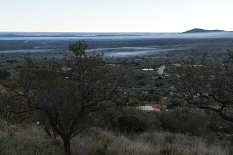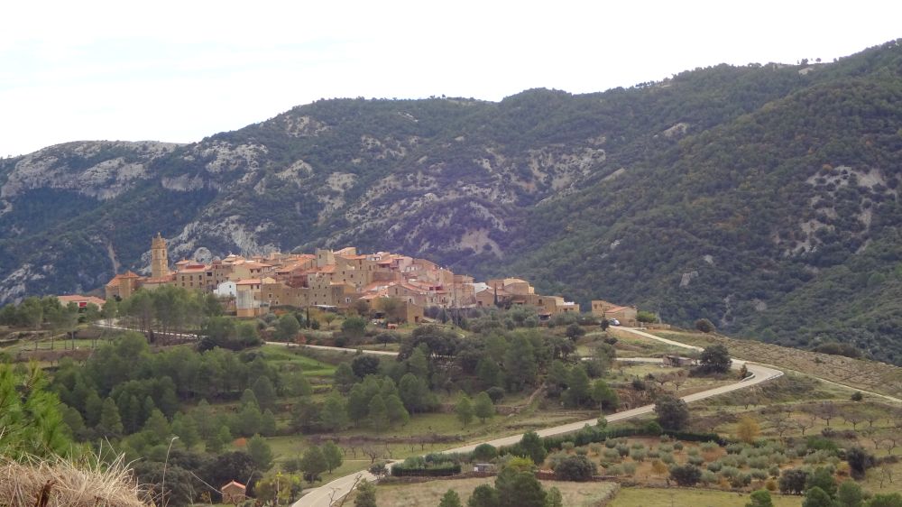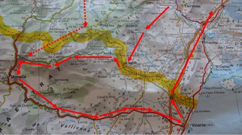 Not much later after that coffee break, Cabrera left Morella with most of his troops to retreat north to Berga. They did so early in the morning. It was very cold then and they intended to reach the warmer Ebro valley as quickly as possible. “Cabrera y el ejército emprendieron la marcha al rayar el alba. Hacía un frío que pelaba, y la tropa… llevaba tapabocas. El Maestrazgo era una región terrible y necesitaban llegar a la cálida ribereña lo más pronto posible.” (p. 190). My guidebook says that temperatures in winter can feel as low as minus 20 degrees centogrades, as wind and frost are cumulating.
