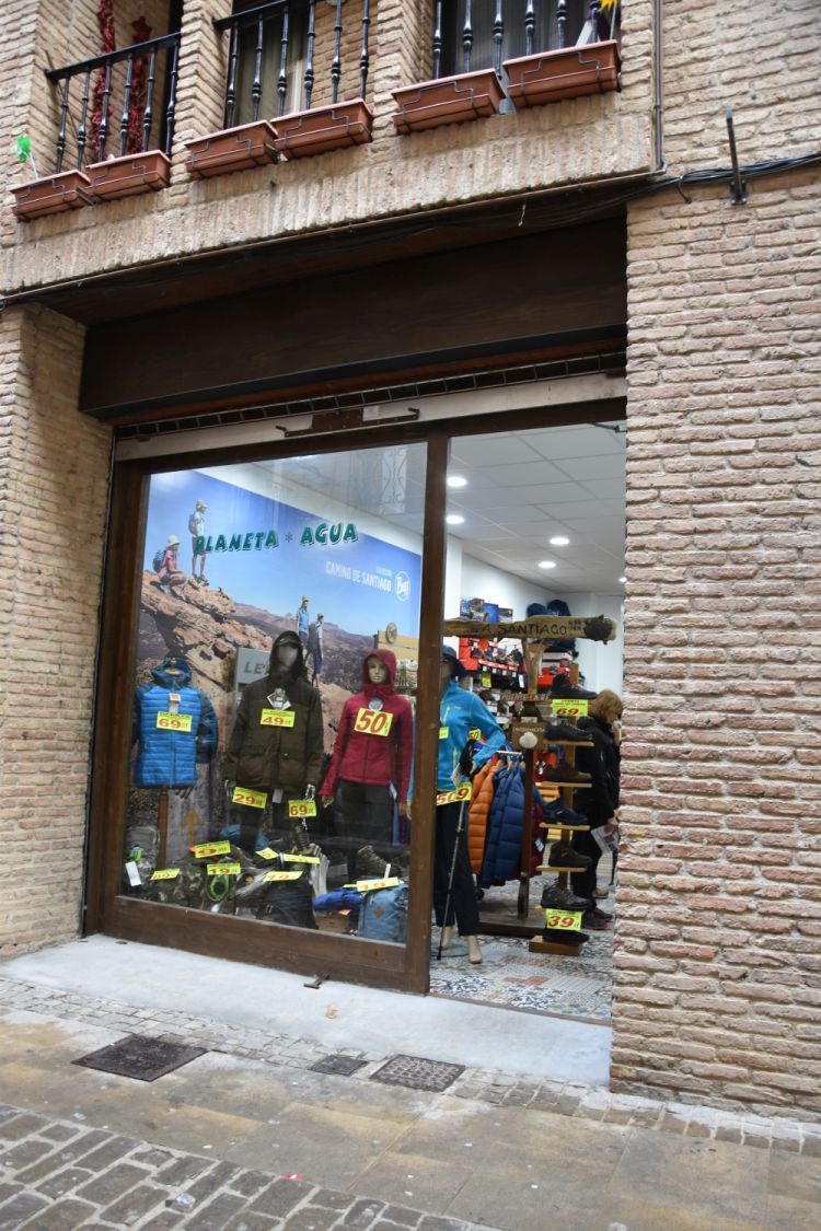 The city also caters for the pilgrims. The restaurants offer cheap pilgrim menus for 5 to 6 Euros and shops sell trekking clothes that are particularly useful now that it rains so much. We buy jackets and shoes here (though not being pilgrims). The “Planeta Agua” belongs to a chain that we also find in other towns along the Way of St. James.
