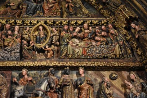 The story continues with the flight of Maria and Joseph to Egypt and the Adoration of the Kings. Above are Maria’s death and her ascension.