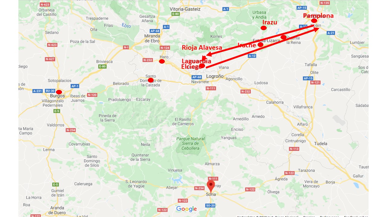 In rainy November 2019, we spend a few days in Pamplona and explore the city and the surroundings. Our first excursion has taken us to Puente de la Reina. Now, our second excursion takes us to the vineyards of Rioja Alavesa, Laguardia and Elciego. Because it starts to pour with rain around midday, we return to Pamplona early and return to Laguardia on the next day.