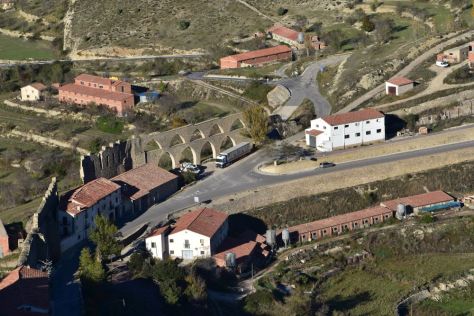 Zooming I can see the medieval aqueduct from the 14th century that up to the 19th century provided Morella with water from the near mountains. I believe that I see a ditch behind the aqueduct.