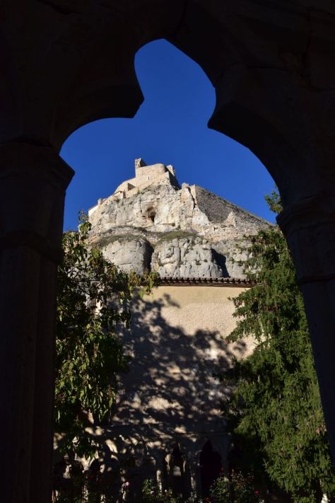 High above the Convento San Francesc is the castle. The access is in the cloister. This is the castle seen through one of the arches of the cloister.