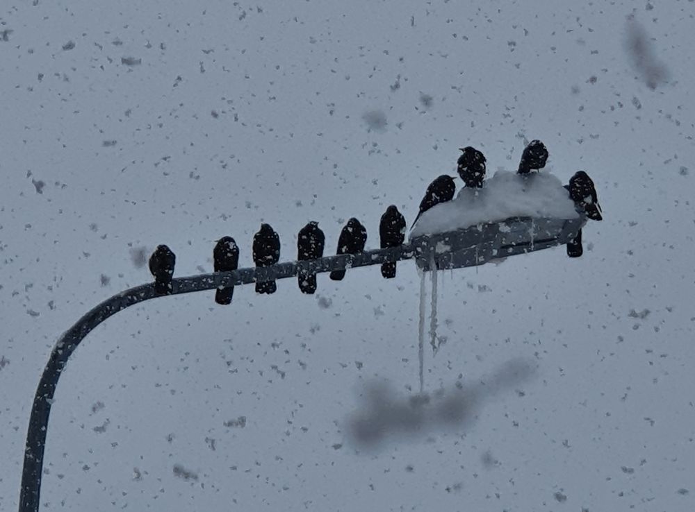 The black crows (or choughs) congregate on the street lamp.