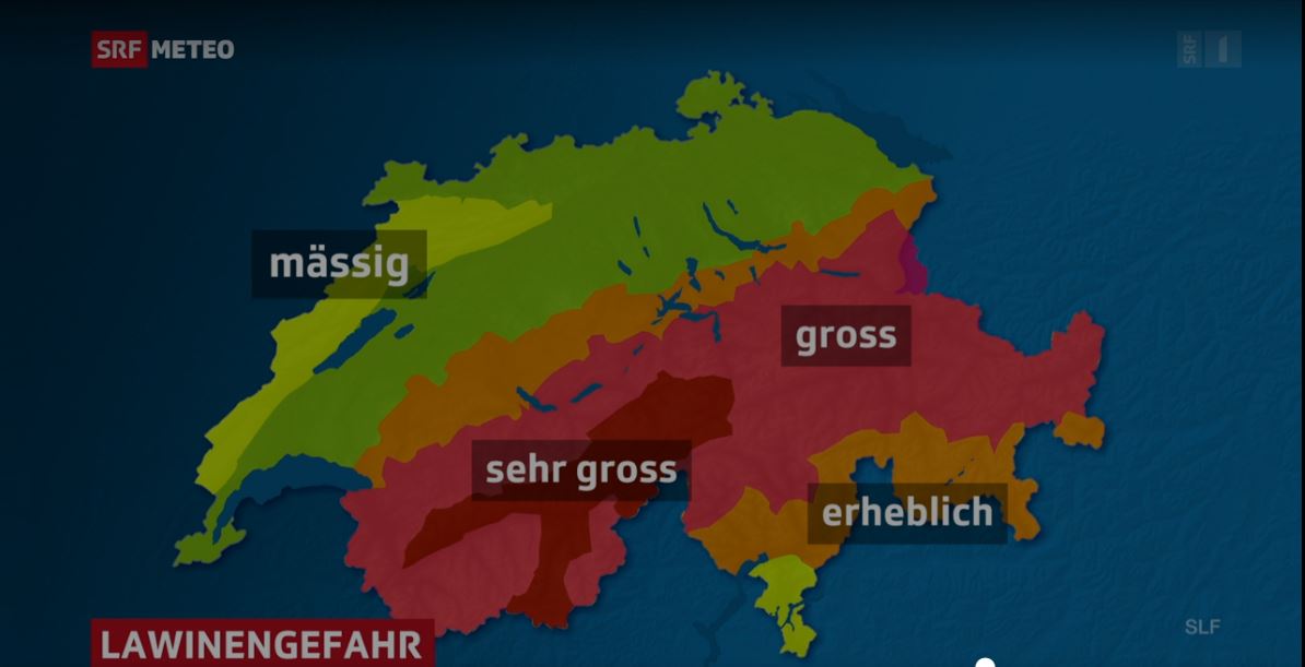 Later the danger of avalanches switches to “sehr gross” (5 = very high), which is the highest level. Several avalanches went down during the day, even cutting into the unstable old snow layers.