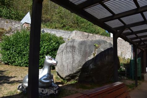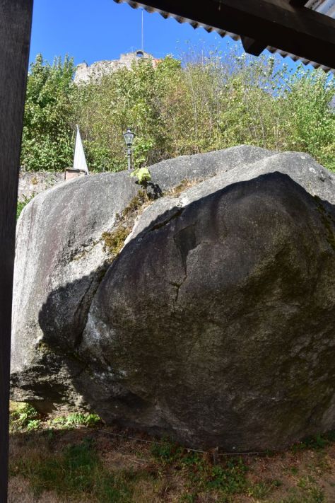 In 2010, the city named this lump of rock “dragon rock” (Drachenfels). On 25th of November 2009, it had broken off under the castle, slid down, destroyed two castle walls and stopped here above the spa gardens.
