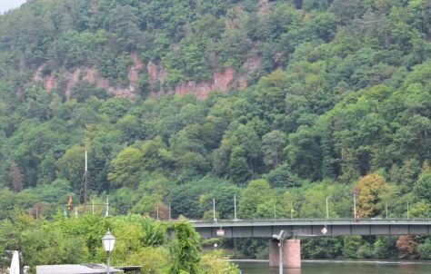 The eastern and southern Odenwald is different. It is dominated by sand- and claystone (Sand- und Tonsteine). They are sediments deposited, when, in the Mesozoic, the area was covered by lakes and traversed by rivers (about 240 million years ago). I came across this sandstone rock at Neckargmünd on the river Neckar.
