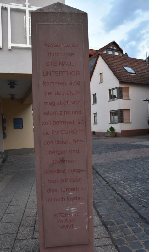 Twinkling with an eye in 2007, Steinach installed the milestone that welcomes travellers (Reysende) and invites them to spend some Euros in the shops, inns and restaurants (läden, herbergen und tavernen) so that these will not be in need henceforth (auf dass diese fürderhin nit noth leyden).